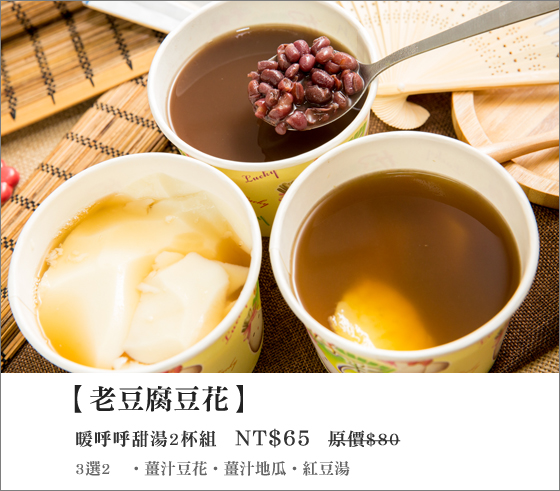商品訊息簡述: 只要65元即可享有【老豆腐豆花】原價80元暖呼呼甜湯2杯組:薑汁豆花/薑汁地瓜/紅豆湯(3選2)。